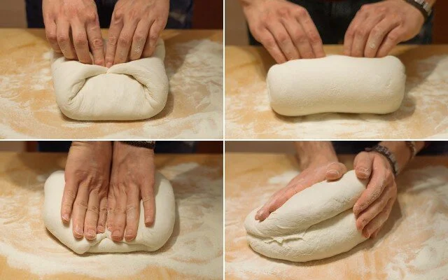 A questo punto, l’impasto viene messo su una spianatoia o sul tavolo e gli si da una piega (che favorisce la puntatura) e lo si mette a riposare in un contenitore coperto da un panno o una pellicola trasparente per 120 min.